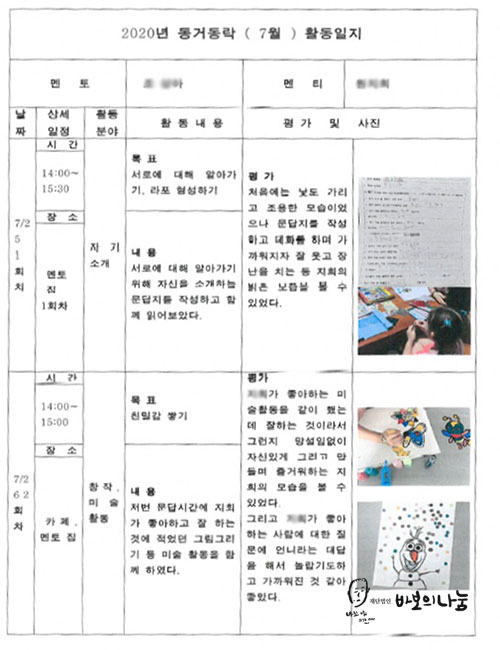 멘토들은 3차례 간담회를 통해 서로의 멘토링 상황을 공유하며 멘티들과 어떻게 하면 더 즐겁게 활동할 수 있을지, 상처받은 마음을 어떻게 보듬어줄 수 있을지 같이 고민하는 시간도 소홀히 하지 않았습니다.
