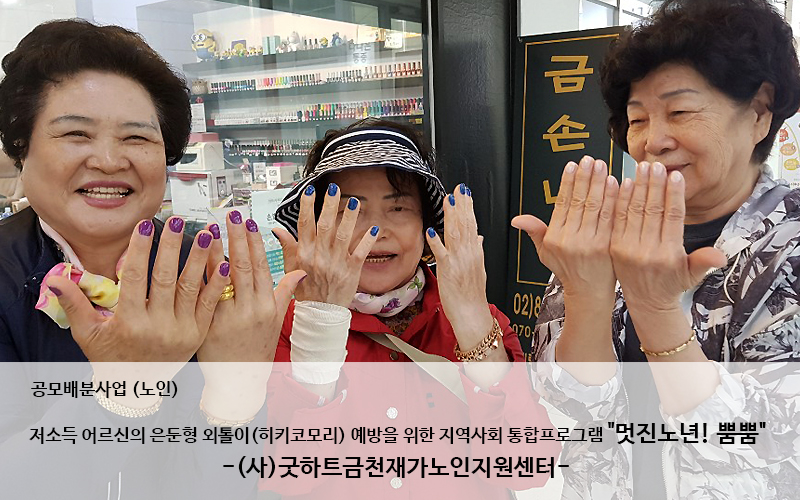 | 2019년 | (사)굿하트금천재가노인지원센터 | 저소득 어르신의 은둔형 외톨이(히키코모리) 예방을 위한 지역사회 통합프로그램 “멋진노년! 뿜뿜” | 9,727,000원 |