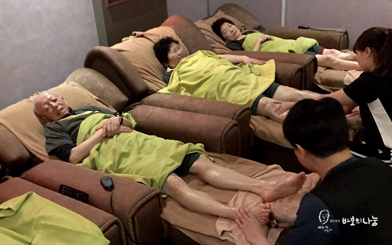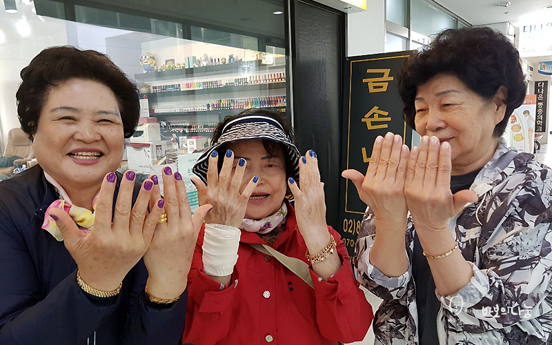 <네일아트를 받고 예뻐진 손을 보고 좋아하시는 어르신들>