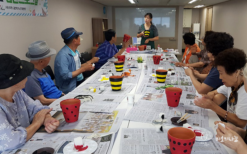 정서적 안정과 우울감 완화를 위해 원예치료에 어르신 심리치료에서 많이 사용되는 회상기법을 접목하여 집단프로그램을 월 2회씩, 총 24회 진행하였습니다. 이를 통해 우울증세가 약 5% 완화되었다고 합니다. 참여하신 어르신 간에 유대감이 형성되어 집이 가까운 어르신들은 프로그램 이후에 모임을 가지시기도 하는 변화가 생겼습니다.