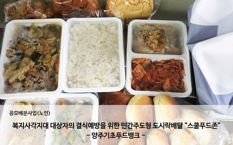 양주기초푸드뱅크가 복지사각지대에 계시는 독거 어르신 분들에게 전달하는 도시락 속 음식은 관내 15개의 학교와 협약을 맺어 학교에서 만들어진 급식 중 배식되지 않은 음식들 입니다. 이 음식들을 자원봉사자들과 함께 도시락으로 만들어 결식 우려 독거 어르신 가정에 배달하고 있는데요. 곳곳에 계신 독거 어르신 가정의 한 끼를 책임지기 위해 양주기초푸드뱅크는 더 많은 도시락을 만들려고 노력했습니다.