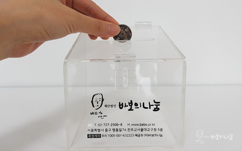 십원짜리 하나, 백원짜리 하나 바보의나눔은 절대 허투루 쓰지 않습니다! 저금통에 담긴 금액 그대로 어려운 이웃을 위해 전달합니다! 소중하지 않은 기부는 없으니까요!