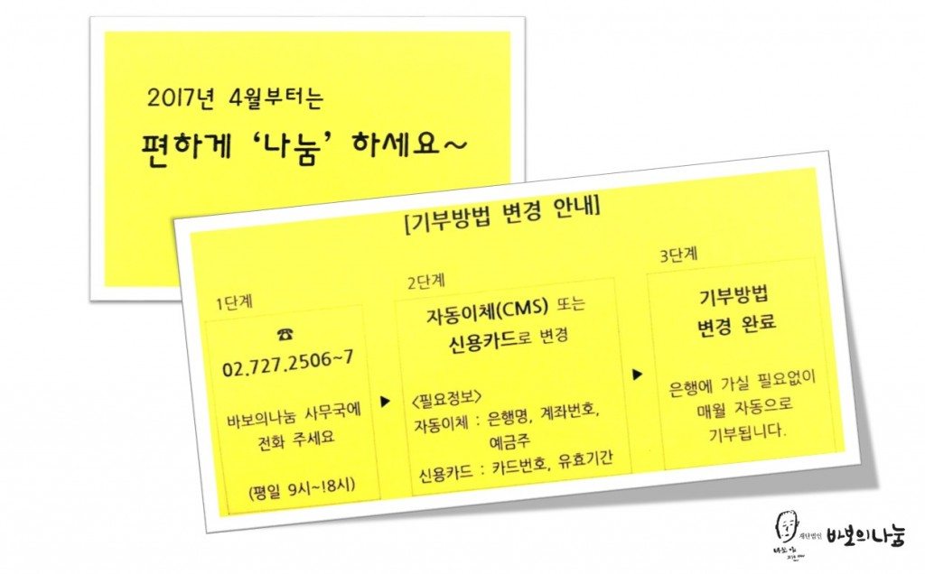바보의나눔 사무국에 전화 주셔서 자동이체나 신용카드로 변경하면 끝! 굉장히 간편하죠?