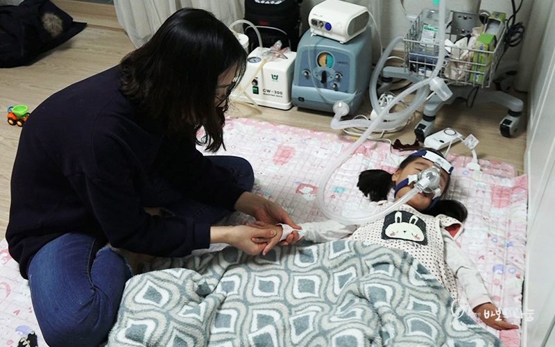 다혜(가명)는 어렸을 때부터 점점 근육이 손상되면서 움직일 수 없는 척수성 근위축증이라는 근육병을 앓고 있었습니다. 근육 손상으로 침을 삼킬 수 없어 가래로 숨이 차기에 하루에도 가래를 빼내는 석션을 수십 번 해야 했는데요. 그래서 엄마의 곁은 24시간 늘 다혜의 석션기가 차지하고 있습니다.