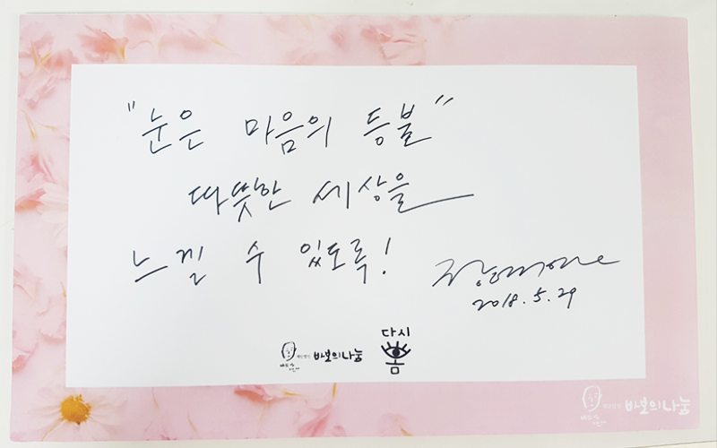 ‘눈은 마음의 등불’이라는 말처럼 개안 수술을 통해 많은 분들이 ‘등불’같은 따뜻한 세상을 느낄 수 있었으면 좋겠다며, 이렇게 적으셨다고 합니다. 실명 위기에 처한 분들께서 세상을 다시 보게 된다면 아마 눈이 오는 날도, 바람이 쌩쌩부는 날도 장예원 씨의 말처럼 모든 게 따뜻하게 느껴지겠죠? 이 따뜻한 세상을 많은 이들이 보고 느낄 수 있기를 간절히 바랍니다.
