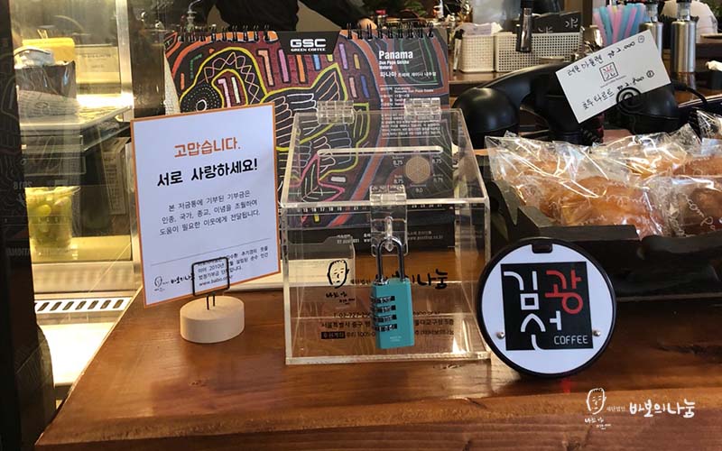 땡그랑 한 푼, 땡그랑 두 푼! 바보의나눔 저금통 기부에 동참하시겠다는 곳이 생겼어요. 바로 을지로에 위치한 ‘광커피’ 가게인데요. 가게의 한 편에 작은 저금통을 놓아주셨습니다. ‘광커피’의 사장님은 커피 대회에서 순위에 드시기도 하셨고, 커피 대회의 평가 위원으로 활동하시는데요. 을지로에서는 좋은 커피, 맛있는 커피로 이미 소문이 자자하다고 합니다.