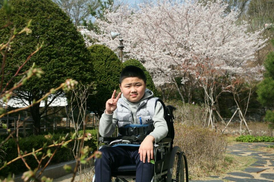 <맞춤형 휠체어에 앉아있는 현철이 >