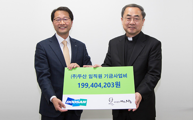 <(주)두산 김윤건 전무(좌), (재)바보의나눔 손희송 주교(우)>