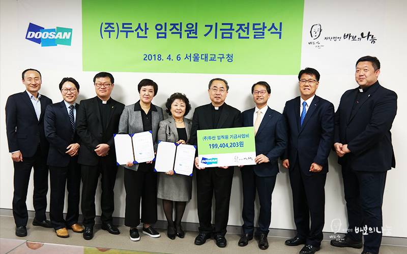 2018년 4월 6일(금) 오후 3시, (주)두산에서 (재)바보의나눔에 2억여 원(199,404,203원 )을 전달하는 기금 전달식이 진행되었습니다. 기금 전달식에는 ㈜두산 김윤건 전무, (재)바보의나눔 이사장 손희송 주교, 서울장학재단 송연숙 사무국장, 동방사회복지회 김진숙 회장을 비롯한 많은 분들께서 참여해주셨습니다.