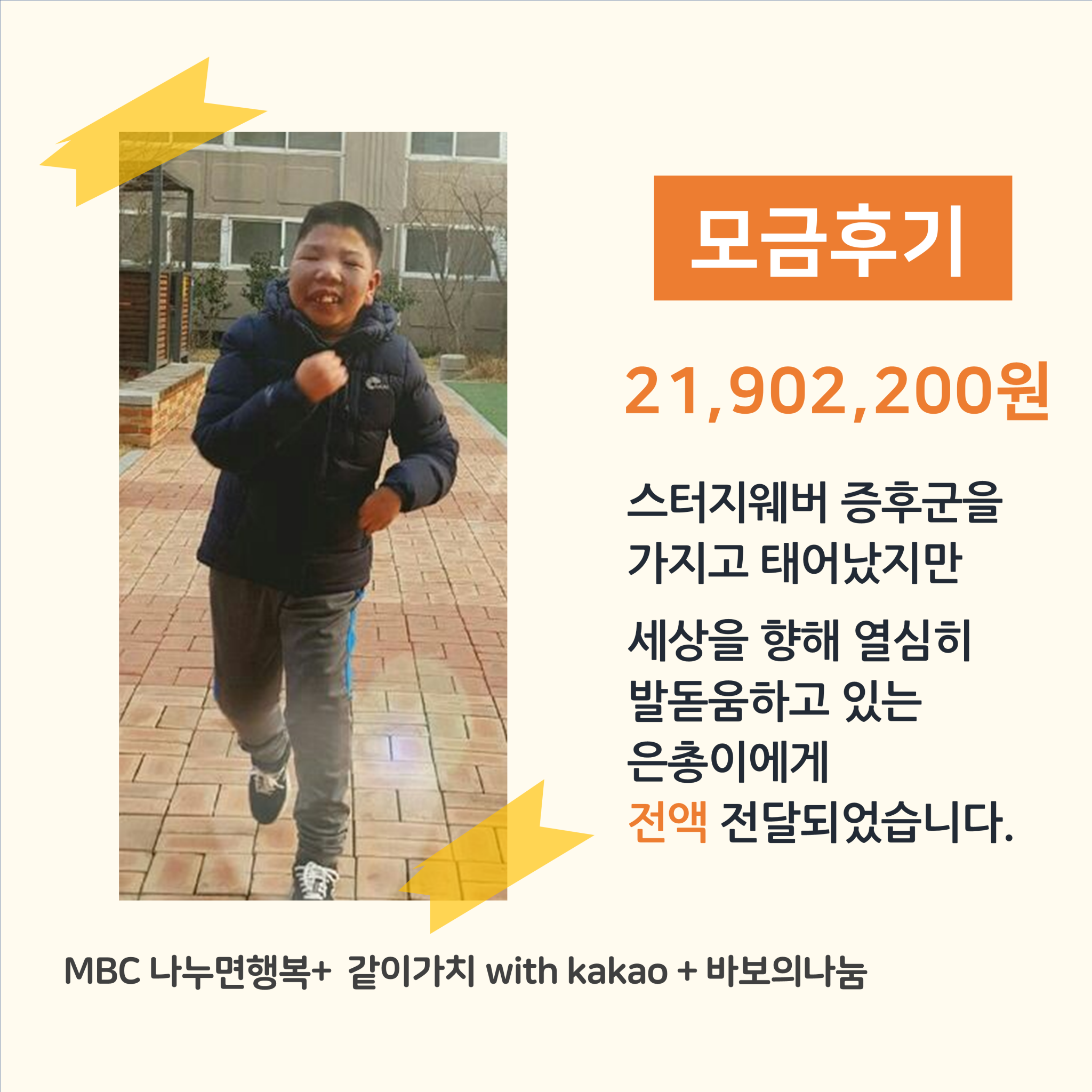 은총이 아버님께서 기부자님께 전한 감사의 말씀을 전달해요. “기부자님! 안녕하세요. 은총이는 잘 지내고 있어요!, 저희가 큰 이렇게 고마움을 받아본 게 처음입니다. 작든 크든 기부해주셔서 감사합니다. 저는 아직도 이렇게 은총이랑 뛰고 있습니다. 저는 아마도 은총이와 이렇게 옆에서 평생 뛰겠죠. 고맙다는 말씀 밖에..그리고 앞으로 노력하겠다는 말씀 밖에 드릴 수 없네요. 감사합니다. 계속 지켜봐주세요!”