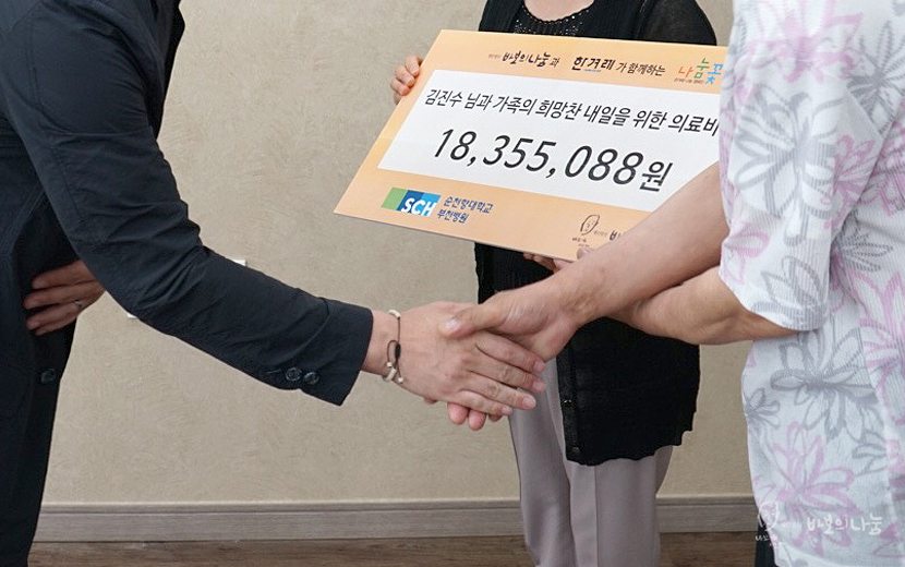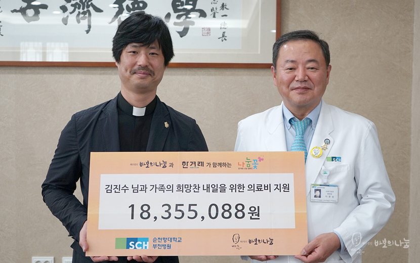 5월 23일(월)에 진행된 기부금 전달식에는 순천향대학교 부천병원 이문성 원장님께서 함께 해 주셨습니다. 김진수님의 사연이 너무 안타까워 만약 나눔꽃 캠페인에 소개되지 못했더라도 치료비 걱정 없이 치료받으실 수 있도록 노력하였을 것이라는 말씀만으로도 참된 의료인이라는 생각에 감사했습니다.