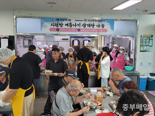 [중부매일 김정기 기자] 기업과 사회복지시설이 협력해 지역사회 이웃을 위한 행사를 펼쳐 눈길을 끌었다. 두산전자BG 사업 본사와 증평군장애인복지관이 주인공이다. 19일 두 기관이 복지관에서 ‘시원한 여름나기 삼계탕 나눔’ 행사를 했다. 불볕더위 상황에서 지역 장애인들에게 영양 가득한 삼계탕을 나눠주는 온정의 손길이다. 행사에 들어간 비용은 고 김수환 추기경이 설립한 (재)바보의나눔에서 120여만원을 지정 기탁해 의미를 더했다. 이날 130명의 복지관 이용 장애인에게 삼계탕을 대접하고 20명의 재가장애인에게는 직접 가정을 찾아 삼계탕을 전달했다. 정찬연 관장은 “두산전자의 따뜻한 배려가 지역사회에 온기를 느끼게 한다”며 “복지의 온기가 일상에 스며들 수 있도록 지속적인 나눔과 지원을 이어가겠다”고 했다. 두산전자BG 관계자는 “기업의 사회적 책임을 다하기 위해 다양한 사회공헌 활동을 이어가고 있다”며 “주변 어려운 이웃에게 실질적인 지원이 이뤄질 수 있도록 나눔을 실천하겠다”고 했다.