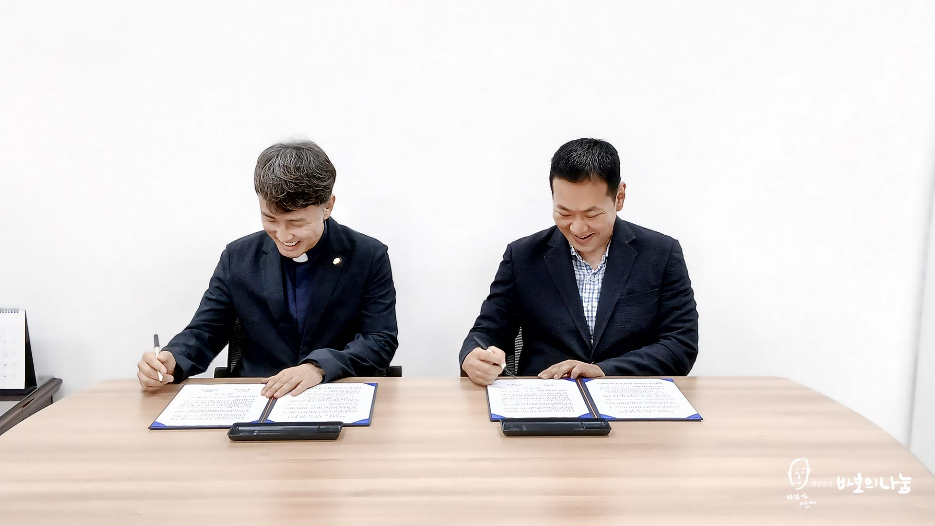 <기부협약서에 사인하는 바보의나눔 상임이사 김인권 신부와 일상미각 박준형 대표>